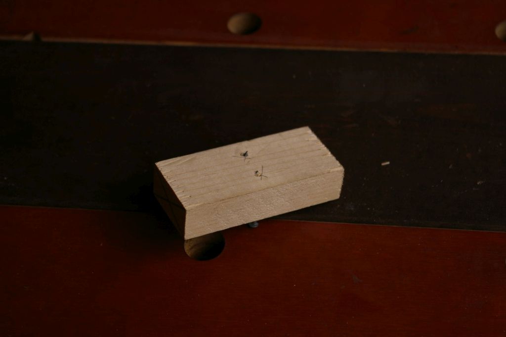 Put two nails into the pivot block. The point of nails should just stick out of the bottom.