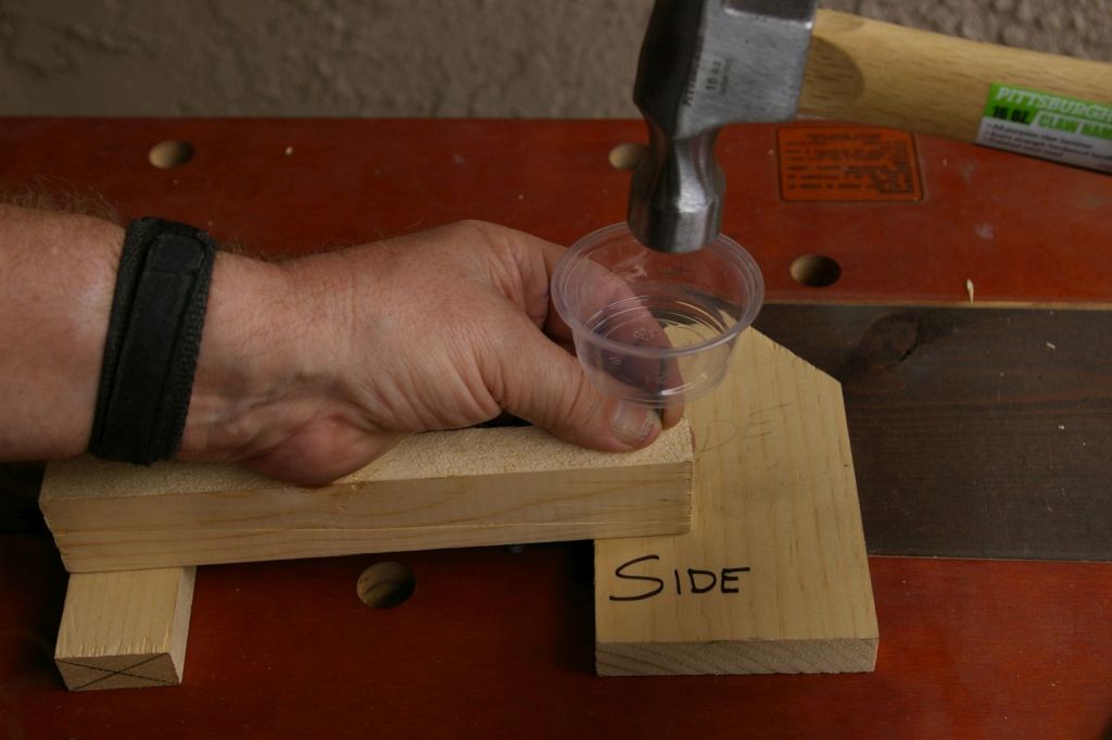 Rest the end of the arm on one of the side pieces. Hold the nail under the cup and start the nail. Drive the nail all the way in.